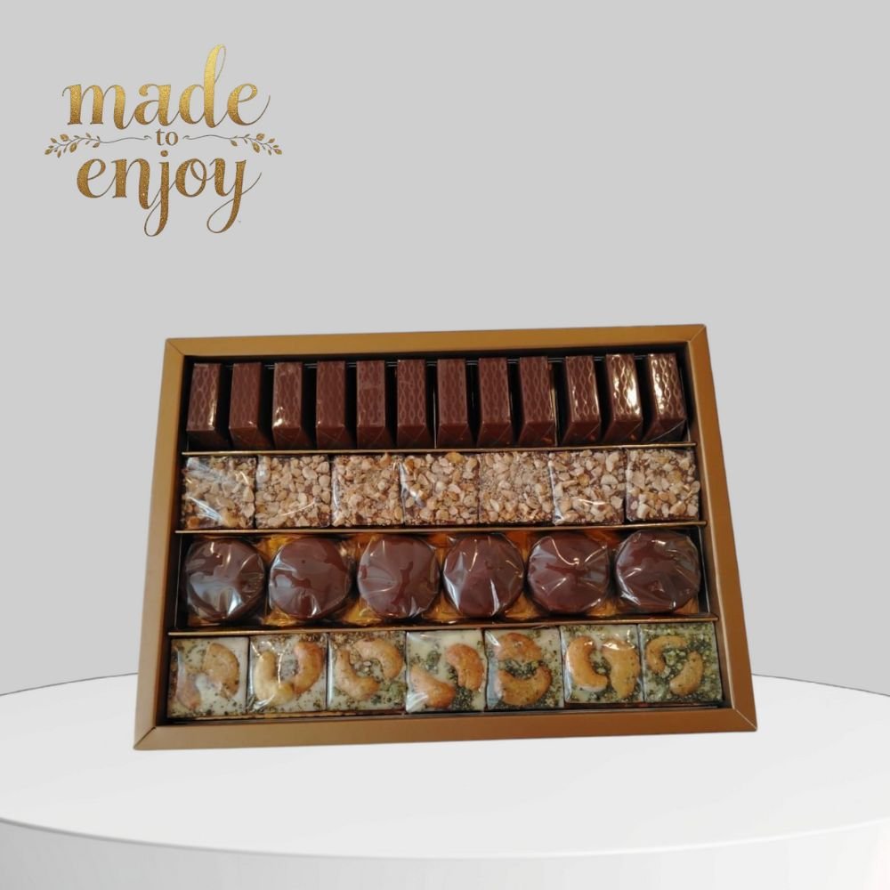 Indulge in pure delight with Bousheyeh’s Exquisite Assorted Chocolate Box. A carefully curated collection of handcrafted chocolates where each filled with rich, gourmet surprises. Every bite is a celebration of flavor and texture, blending premium chocolate with luscious fillings like velvety Nutella, crunchy walnuts, cashews, aromatic pistachios, and crocan. Beautifully packaged and perfect for gifting on birthdays, holidays, corporate, or any special occasion.
