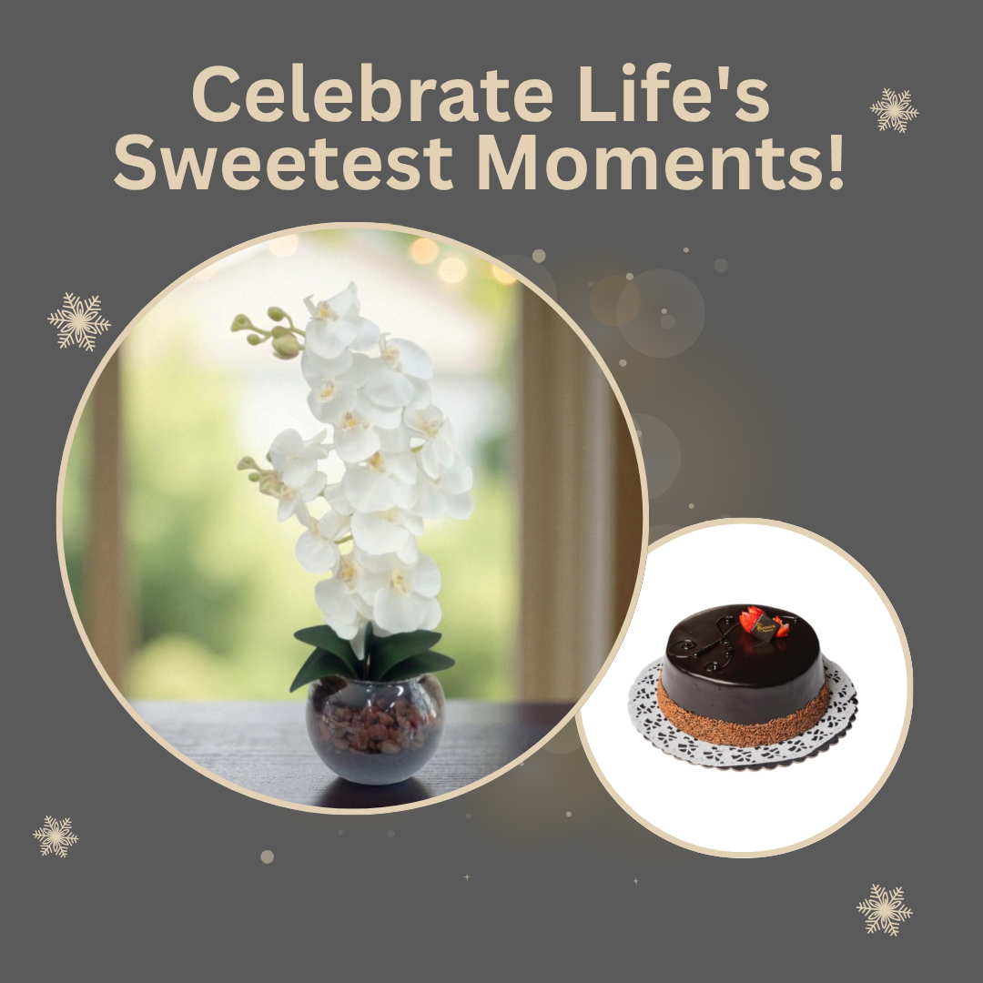 Elevate a special occasion with a gift that blooms and delights. This thoughtfully curated set combines the fresh, sweet flavor of a chocolate chips cake with the timeless elegance of a white fresh orchid plant. More than just a gift, it’s a lasting gesture of beauty and taste, offering both a stunning visual centerpiece and a delicious treat to share.